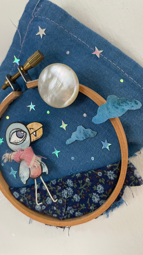 Materials: Watercolor and ink paper cut illustrations, vintage mother of pearl button, reclaimed fabric, wire, hoop.